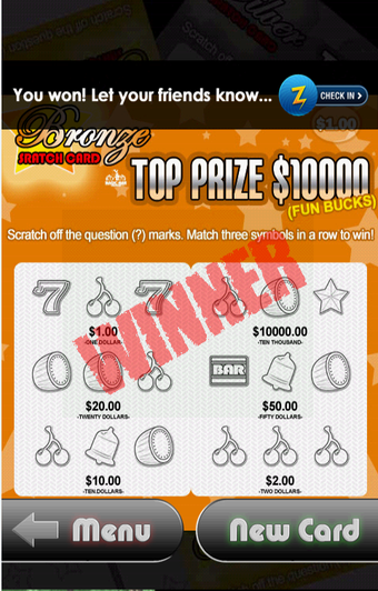 Scratch Kingsでは、起動するとスクラッチカードを選択する画面が表示されます。上の3種類は通常のスクラッチカードで、金銀銅の色別にそれぞれカードの値段と最高賞金が異なります。カードを選択し、銀紙でおおわれた左右3×3、合計18マスを指でこすると、バイブレーションの刺激に合わせて銀紙がリアルに削られるように絵柄が現れます。3つの絵柄が横並びでそろうと当たりで、絵柄に応じた賞金を得ることができます。